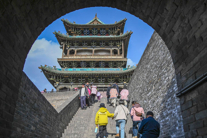 游客登上山西省晉中市平遙古城城墻游覽觀光(2025年4月4日攝)。(新華社發(fā) 梁生仁/攝)
