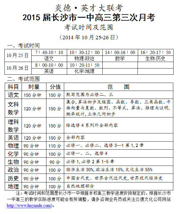 炎德英才大聯(lián)考長(zhǎng)沙市一中2015屆高三第3次月考考試時(shí)間和范圍(2014.10.25-26)