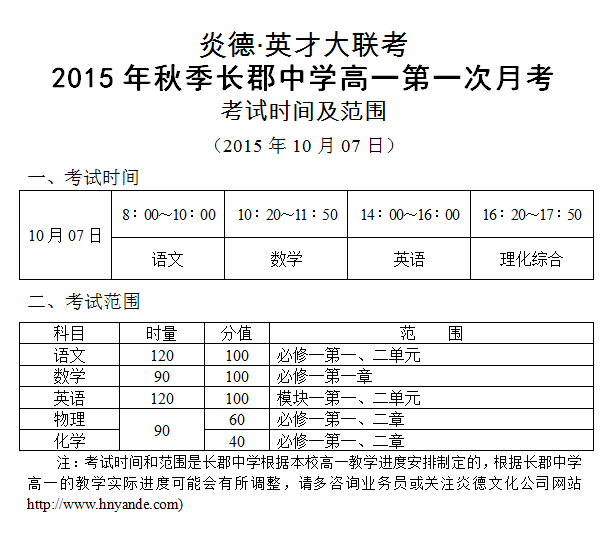 炎德英才大聯(lián)考2015年秋季長(zhǎng)郡中學(xué)高一第一次月考考試時(shí)間和范圍(2015.10.07)