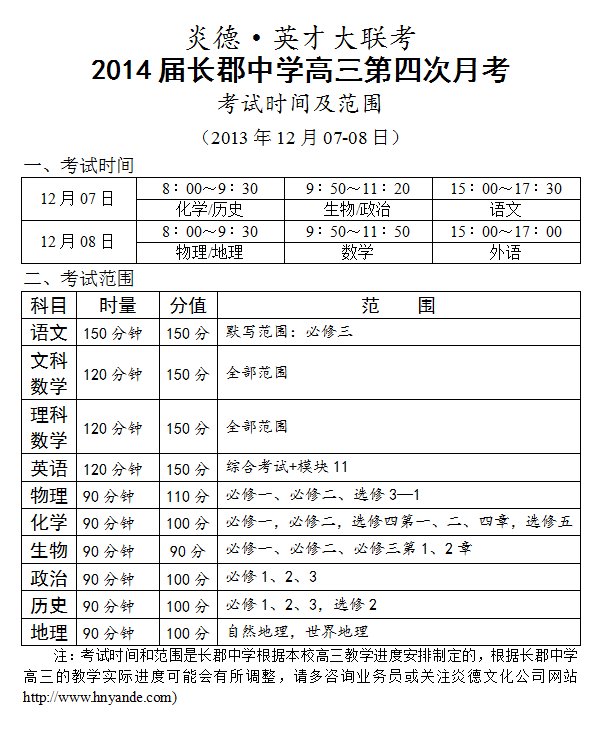 炎德英才大聯(lián)考長郡中學(xué)2014屆高三第4次月考考試時(shí)間和范圍(2013.12.07-08)