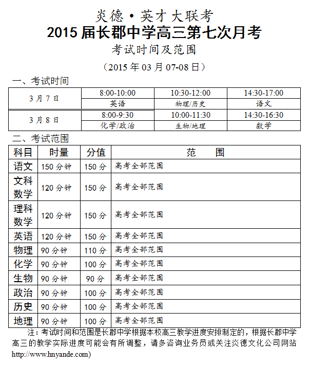 炎德英才大聯(lián)考長郡中學(xué)2015屆高三第7次月考考試時(shí)間和范圍(湖南省十三校聯(lián)考一2015.03.07-08)