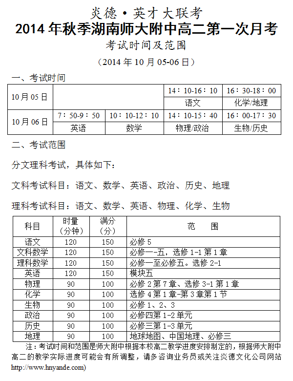 炎德英才大聯(lián)考師大附中2014年秋季湖南師大附中高二第一次月考考試時(shí)間和范圍(2014.10.05-06)