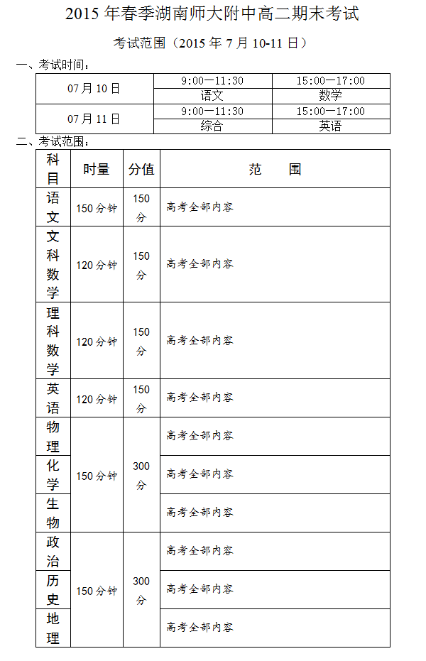 2015年春季師大附中高二期末范圍(2015.07.10-11)