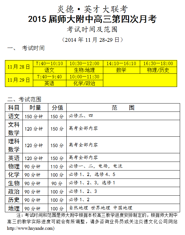 炎德英才大聯(lián)考師大附中2015屆高三第4次月考考試時(shí)間和范圍(2014.11.28-29)