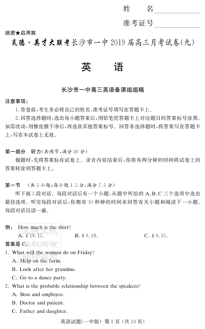 【英語(yǔ)】炎德英才大聯(lián)考2019長(zhǎng)沙一中高三9次月考