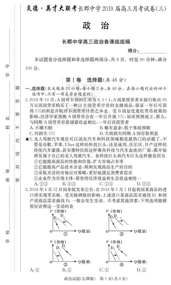 【政治】炎德英才大聯(lián)考2019長(zhǎng)郡中學(xué)高三3次月考