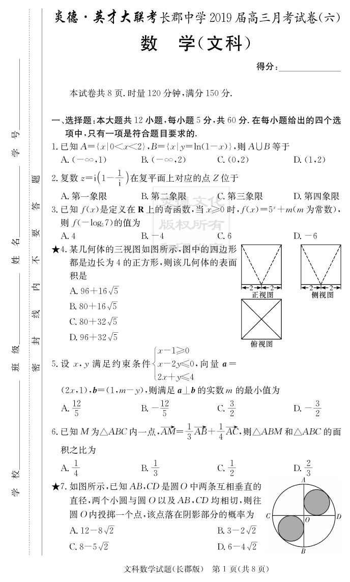 【文數(shù)】炎德英才大聯(lián)考2019長(zhǎng)郡中學(xué)高三6次月考