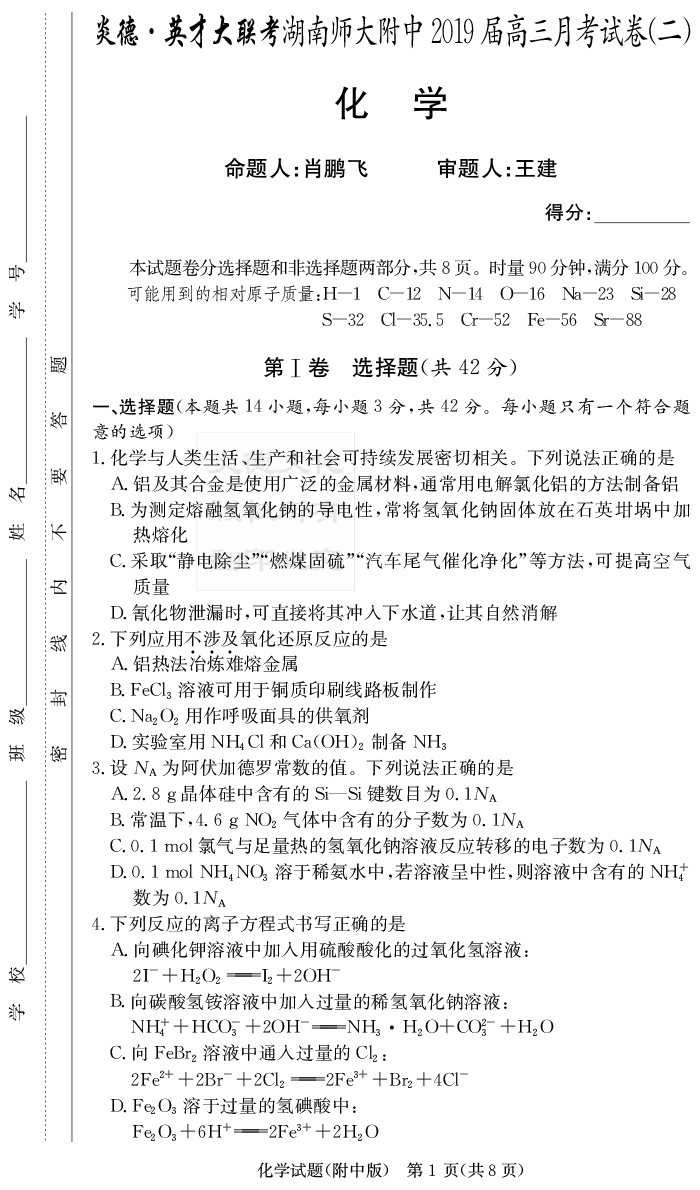 【化學(xué)】炎德英才大聯(lián)考2019師大附中高三2次月考