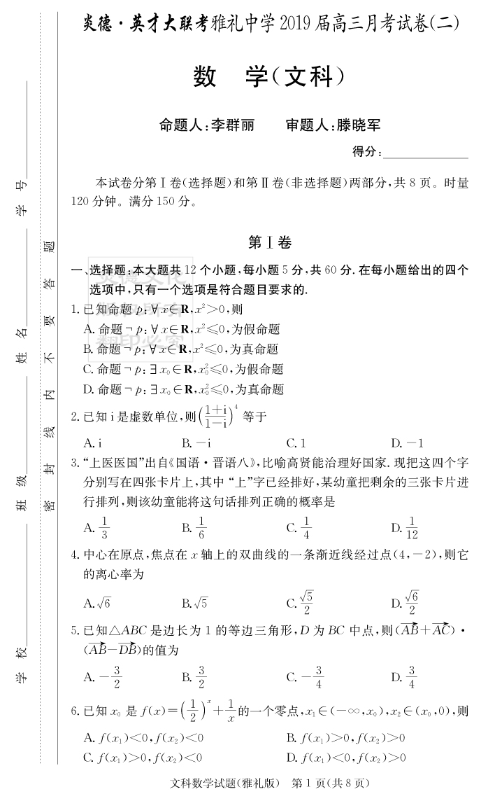 【文數(shù)】炎德英才大聯(lián)考2019雅禮中學(xué)高三2次月考
