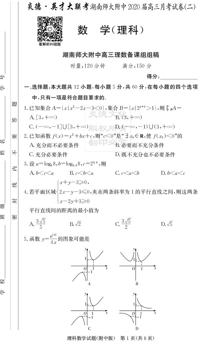 【理數(shù)】炎德英才大聯(lián)考2020屆師大附中高三2次月考