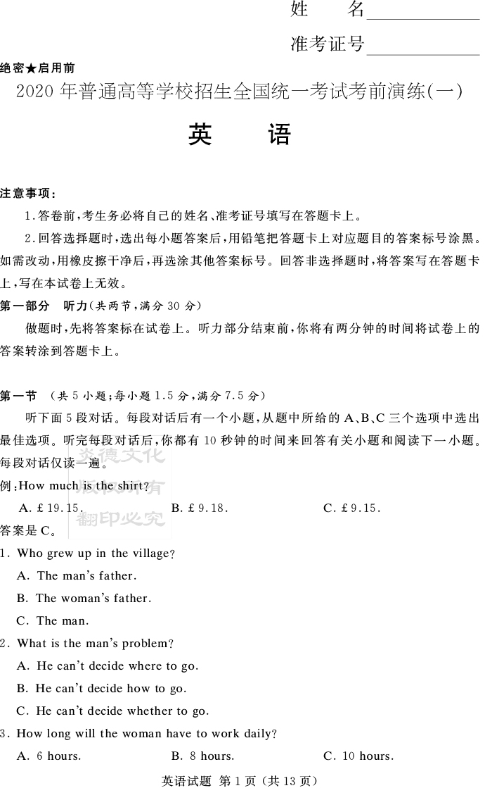 【英語(yǔ)】2020年普通高等學(xué)校招生全國(guó)統(tǒng)一考試考前演練(一)