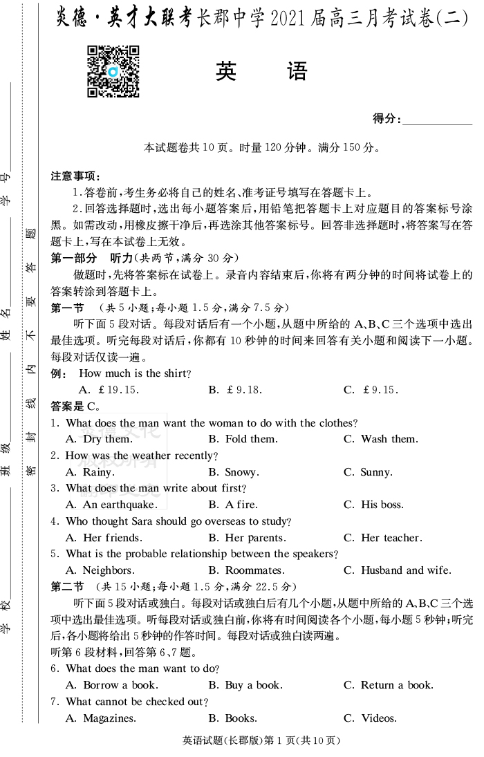【英語(yǔ)】炎德英才大聯(lián)考2021屆長(zhǎng)郡中學(xué)高三2次月考