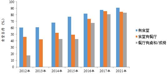 營養(yǎng)改善計劃實施過程中,各地不斷加大食堂建設(shè)力度,為推進食堂供餐提供保障。2021年,在11857所監(jiān)測學校中,90.9%的監(jiān)測學校有食堂,食堂有餐廳的比例為84.4%,餐廳有餐桌、椅凳的比例為83.1%。監(jiān)測結(jié)果顯示,監(jiān)測學校中有食堂的比例逐年增高,從2012年的60.6%增長到2021年的90.9%。