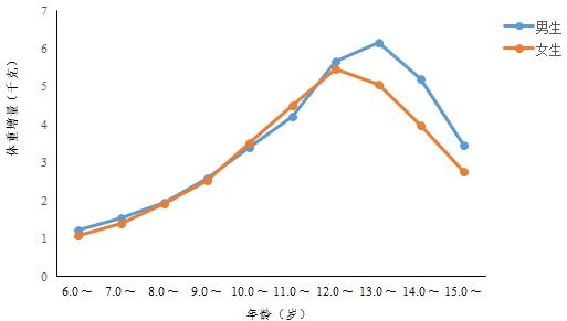 圖2 十年來監(jiān)測地區(qū)6~15歲各年齡段學生平均體重增量