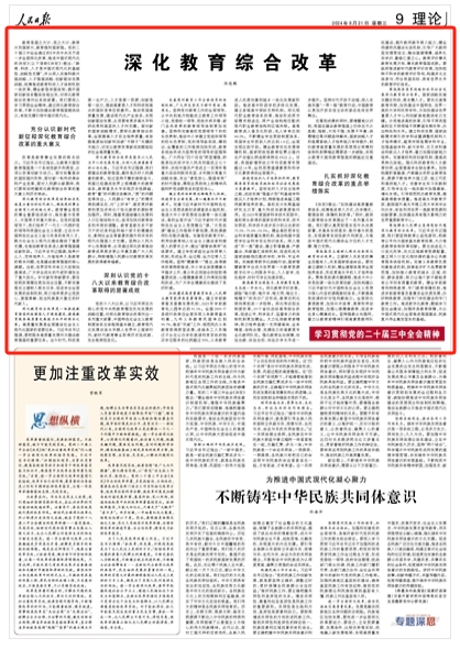 教育是國(guó)之大計(jì)、黨之大計(jì),教育興則國(guó)家興,教育強(qiáng)則國(guó)家強(qiáng)。黨的二十屆三中全會(huì)通過的《中共中央關(guān)于進(jìn)一步全面深化改革、推進(jìn)中國(guó)式現(xiàn)代化的決定》(以下簡(jiǎn)稱《決定》)提出:“教育、科技、人才是中國(guó)式現(xiàn)代化的基礎(chǔ)性、戰(zhàn)略性支撐”,并從深入實(shí)施科教興國(guó)戰(zhàn)略、人才強(qiáng)國(guó)戰(zhàn)略、創(chuàng)新驅(qū)動(dòng)發(fā)展戰(zhàn)略,統(tǒng)籌推進(jìn)教育科技人才體制機(jī)制一體改革,健全新型舉國(guó)體制,提升國(guó)家創(chuàng)新體系整體效能出發(fā),對(duì)深化教育綜合改革作出系統(tǒng)部署。我們要深入學(xué)習(xí)貫徹全會(huì)精神,通過深化教育綜合改革,不斷為加快建設(shè)教育強(qiáng)國(guó)提供動(dòng)力,有效支撐引領(lǐng)中國(guó)式現(xiàn)代化。