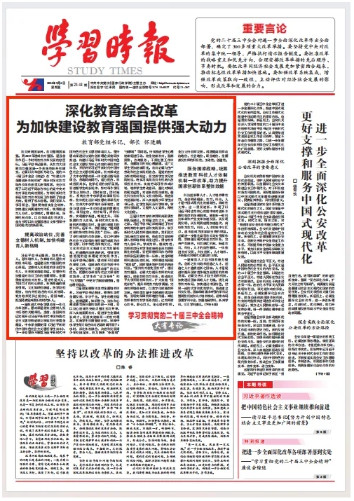 教育興則國(guó)家興,教育強(qiáng)則國(guó)家強(qiáng)。到2035年建成教育強(qiáng)國(guó),是當(dāng)前和今后一個(gè)時(shí)期教育改革發(fā)展的總目標(biāo)。習(xí)近平總書記強(qiáng)調(diào),從教育大國(guó)到教育強(qiáng)國(guó)是一個(gè)系統(tǒng)性躍升和質(zhì)變,必須以改革創(chuàng)新為動(dòng)力。黨的二十屆三中全會(huì)《決定》在“構(gòu)建支持全面創(chuàng)新體制機(jī)制”部分對(duì)深化教育綜合改革作出重大決策部署,充分體現(xiàn)了以習(xí)近平同志為核心的黨中央對(duì)教育事業(yè)的高度重視,為做好新時(shí)代新征程教育改革發(fā)展工作指明了前進(jìn)方向、提供了根本遵循。我們要深入學(xué)習(xí)領(lǐng)會(huì)、堅(jiān)決貫徹落實(shí)全會(huì)精神,加快建設(shè)高質(zhì)量教育體系,統(tǒng)籌推進(jìn)育人方式、辦學(xué)模式、管理體制、保障機(jī)制改革,以改革添動(dòng)力增活力,奮力書寫以教育強(qiáng)國(guó)建設(shè)支撐引領(lǐng)中國(guó)式現(xiàn)代化的新篇章。