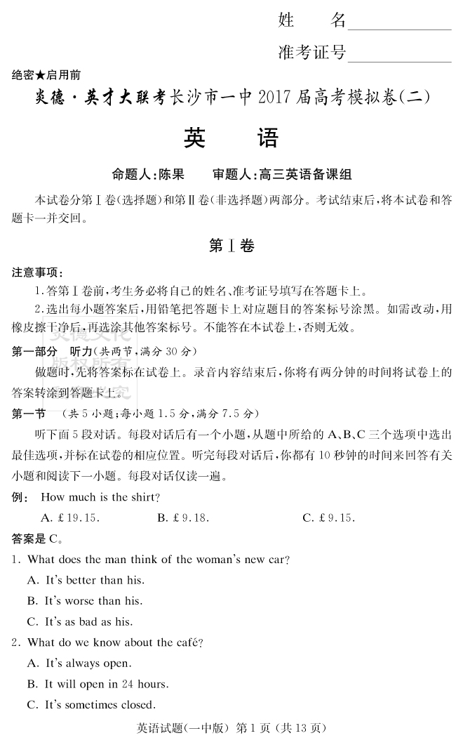【英語(yǔ)】炎德英才大聯(lián)考2017長(zhǎng)沙一中高三11次月考(模擬二)
